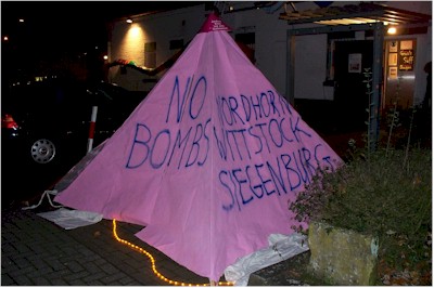 Auf geplanten Zielgebiet auf dem Bombodrom-Gelände hat die Bundeswehr eine hölzerne Pyramide aufgestellt. Was bei den Übungen nur Attrapen sind, sind bei echten Kriegseinsätzen Häuser, Wasserwerke, Brücken - Bomben fallen auf Orte, an denen Menschen leben. Wer eine nachgebaute Zielpyramide im eigenen Lebensbereich aufstellt, signalisiert damit: "Wenn irgendwo Bomben fallen, dann treffen sie uns alle." Zielpyramiden auf öffentlichen Plätzen im ganzen Land können zu einem Symbol der Ablehnung von Krieg und Militär werden.