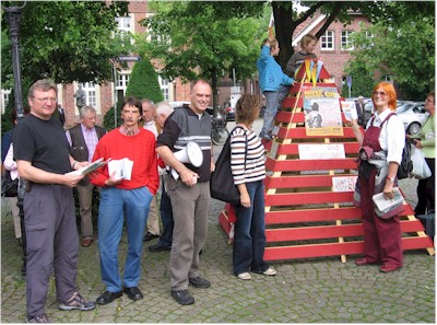 Pyramide auf dem Marktplatz in Lüchow (Wendland) am 30.7.2007, anlässlich des Bombodrom-Prozesses in Potsdam am nächsten Tag. Mobilisierungs-Flugblatt